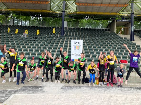 14 Schülerinnen der IGS Bovenden (12 davon aus der Sportklasse 6.3) haben vergangenen Muttertag (8. Mai) mit großer Freude und viel Power am Frühjahrsvolkslauf im Göttinger Jahnstadion teilgenommen. Fynn Kordulla war der Schnellste von uns – nach einer fantastischen Zeit von 9:06 Minuten hatte er als 17. in der Gesamtwertung von rund 220 Läufer*innen und 10. seiner Altersklasse bereits das Ziel erreicht. Begleitet von ihren Lehrerinnen hatten alle Schüler*innen viel Freude an dieser Aktion. Wir hoffen, dass wir im kommenden Jahr noch mehr Sportbegeisterte unserer Schule mit zu diesem Event nehmen können – und wenn es die Lehrerstaffel im kommenden Jahr wieder gibt, dürft ihr uns natürlich auch fleißig anfeuern!!